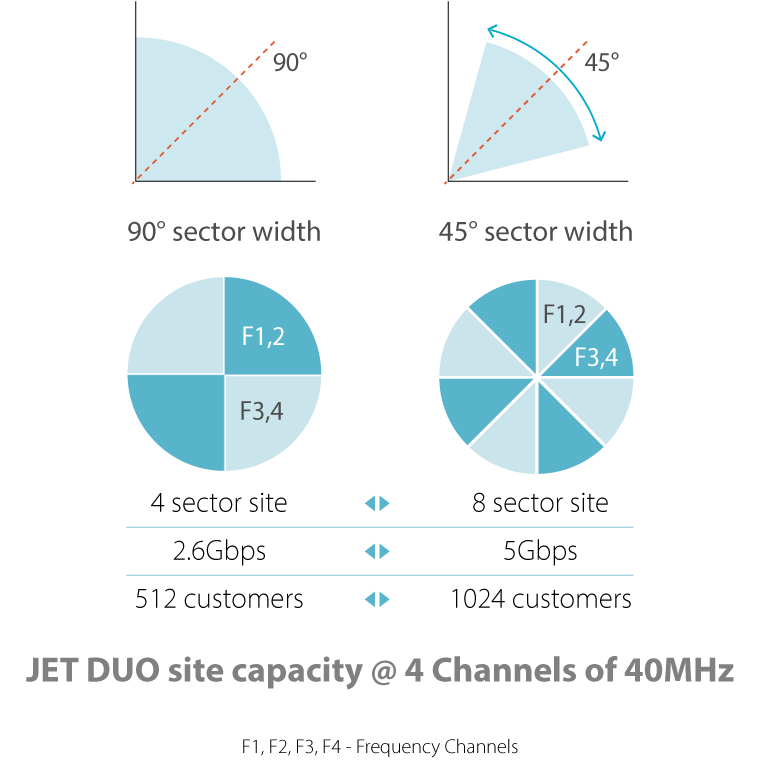 Upon demand for more capacity, network owners can reconfigure their JET DUO antenna sector width from 90° to 60° or 45°, all through software, allowing them to double their network capacity and served customer base utilizing the same frequency channels up to four times.